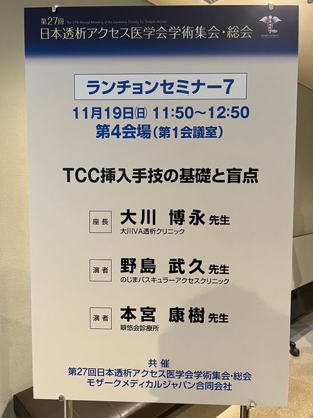 富士市での日本透析アクセス医学会で3演題発表させていただきました.【アクセスクリニックにおけるシャント管理の現況】、【高難度VAIVT症例への対応と工夫】の2演題とスポンサードセミナー【TCC挿入手技の基礎と盲点】で発表してまいりました.日々VAの治療に邁進しておられ本邦を代表される諸先生方と貴重な討論を行うことができ、大変有意義な学会となりました.明日からの診療に役立てて参ります.