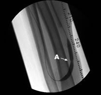 A シャントの狭窄部をバルン(小さな風船状の治療具)で拡張している様子です。この治療をPTAといいます。